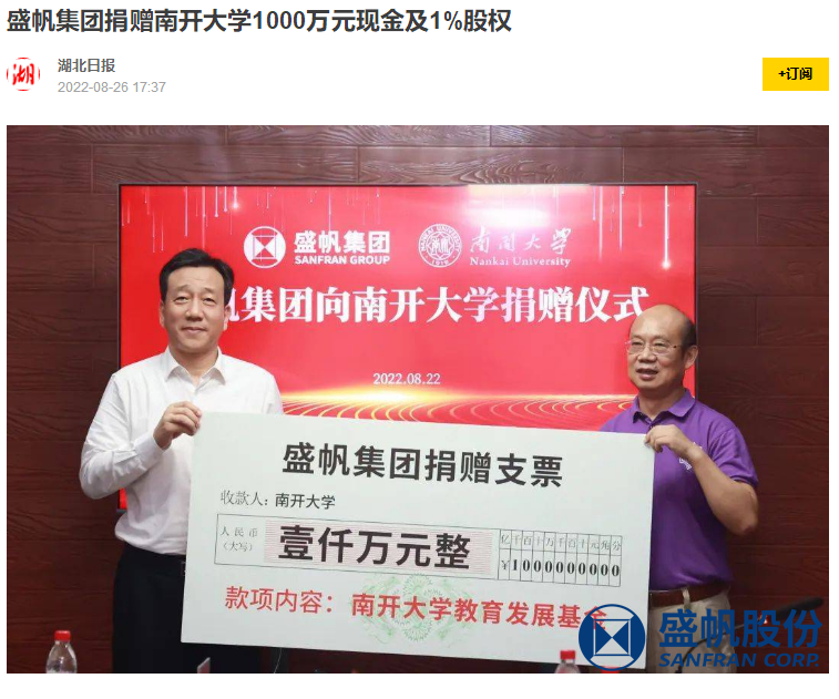 8月22日,完美(中国)集团与南开大学在武汉签署捐赠协议,完美(中国)集团向南开大学捐赠1000万元现金和1%股权,双方开启深度合作。完美(中国)···